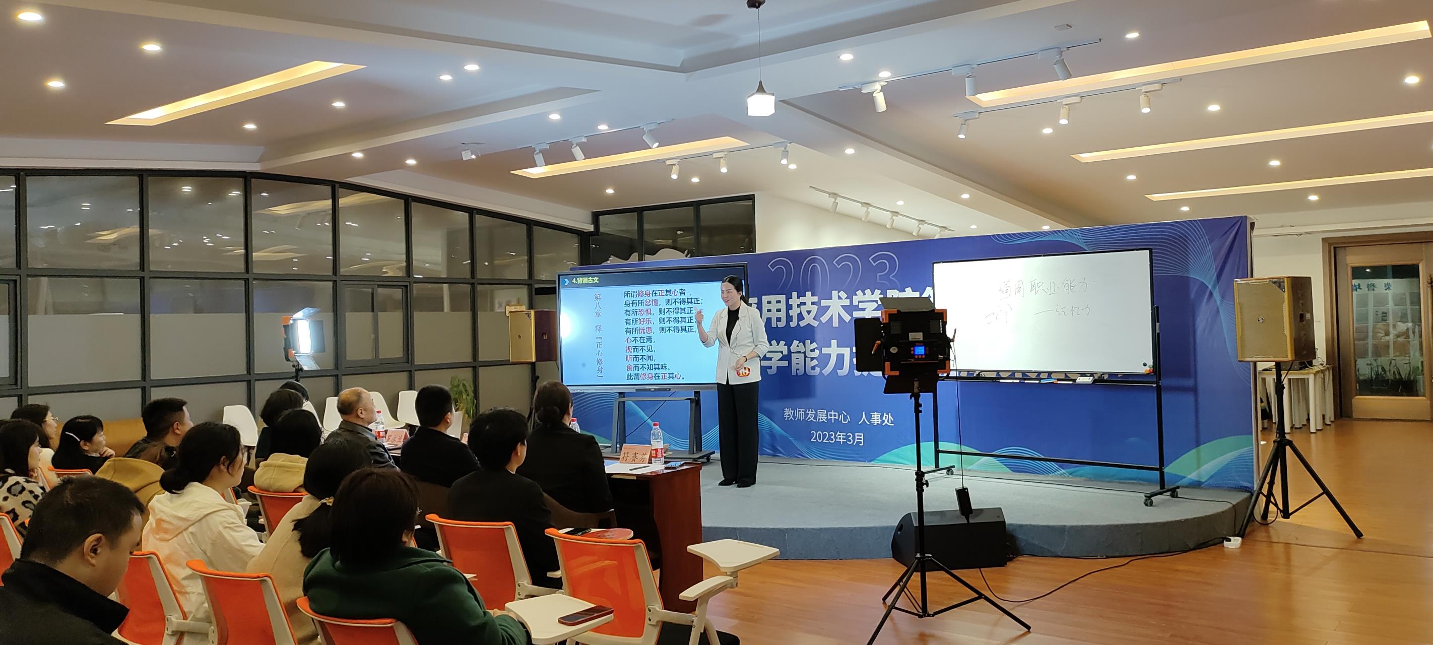 4月4日,学校教师发展中心举行了我校第二期青年教师教学能力成果展示活动。学校从参加培训的70余位青年教师中随机抽取了10位教师,上台完成10分钟的微课展示。我院余佳佳老师在仪态仪表、教学方法、教学内容上赢得了评委们的一致好评,被评为一等奖。
