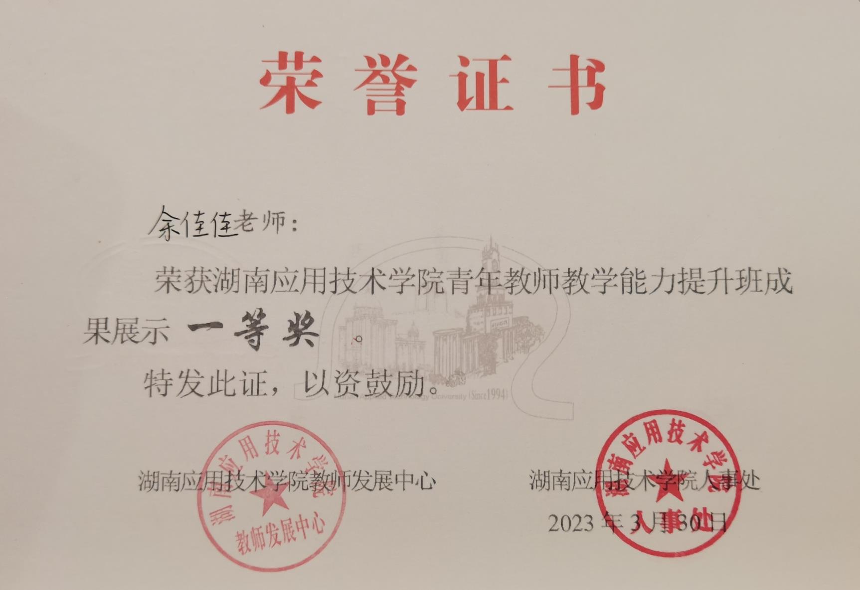 余佳佳获得青年教师教学能力成果展一等奖
